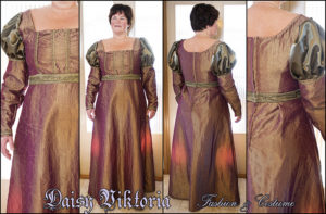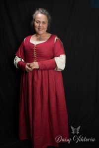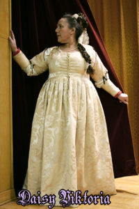 “Daisy can fit any body type and make it look fantastic. I got so many compliments on my Gold/Red Venetian at the Yules I attended this weekend. She has wicked mad skills and talent, too. Her craftsmanship and dedication to make period correct garb is well worth the price she charges. Having seen her work, I fully expected her fee to be double. My gown is so beautifully crafted I know will out last me, so treat me nicely and I might just bequeath it to you, but do yourself a favor and let Daisy create your dream garb ’cause I’m not gonna croak for a very long time!”